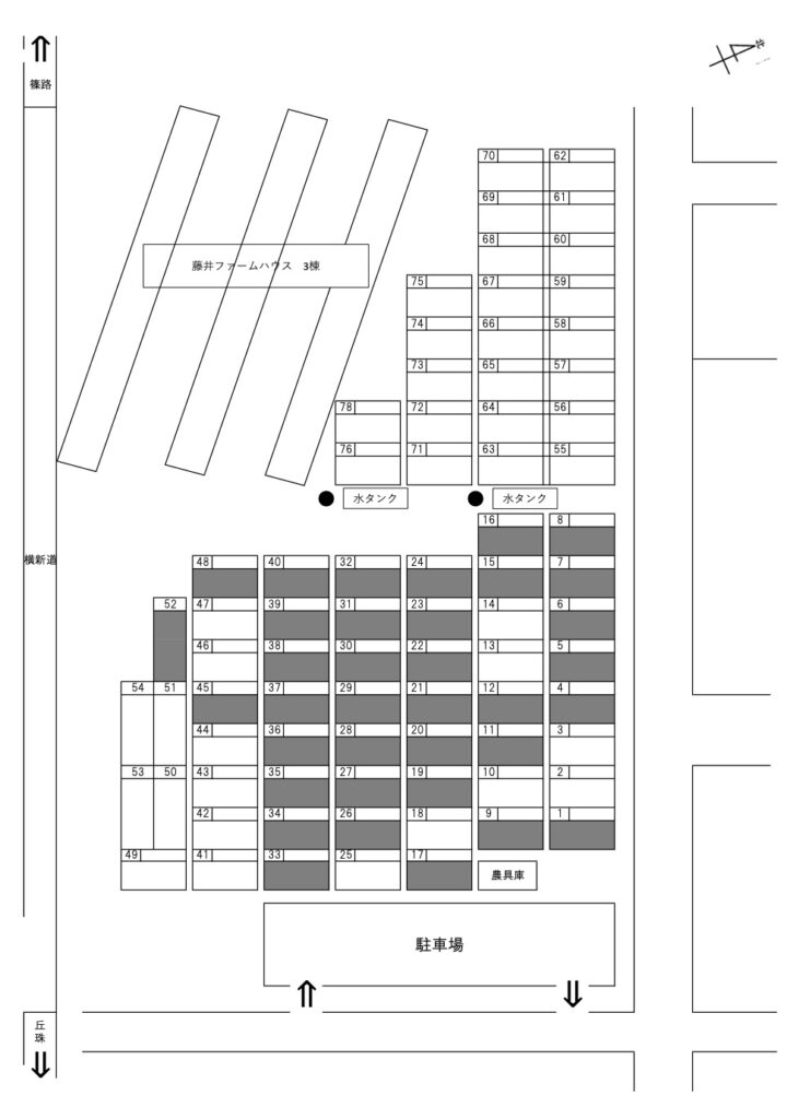 ※現在調整中です。3月末までには正確なものを更新します。なお図面の灰色の区画は昨年ご契約いただきました方のご利用予定地でございますので、それ以外の区画は随時ご契約いただけます。